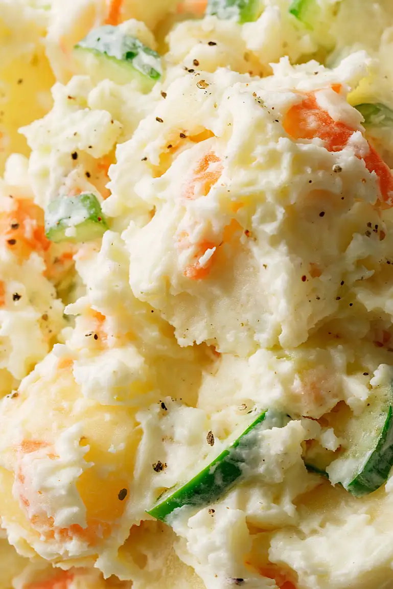 - Peel the cooled eggs, then separate the whites from the yolks; chop the egg whites into small pieces and reserve the yolks for garnish. Transfer the cooled mashed potatoes to a large mixing bowl, then add the chopped egg whites, diced apple, minced onion, white parts of scallion, prepared cucumber, carrot, raisins, and the dressing mixture from Step 2. Fold everything together gently but thoroughly until well combined, being careful not to overmix which can make the salad gluey. Taste and adjust seasoning with salt and black pepper as needed.